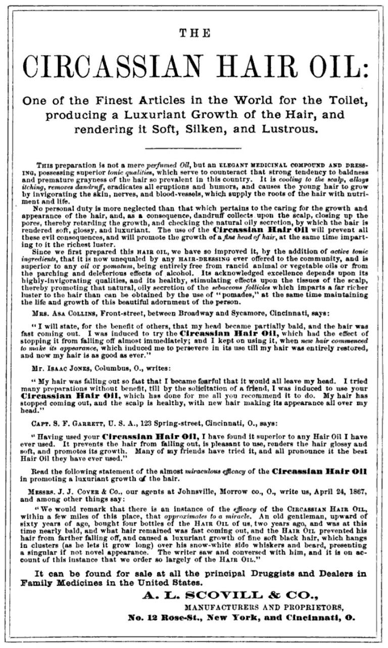 The earliest ad I've found for this product was from 1837 (See below). At that time it was being concocted in America from a recipe that was from a Dr. Stillman in Europe. Later on I found one called Ferran's Circassian Hair Oil, but I could not tell if this one pre-dated Scoville's or not. Amon Scoville put his on the market around 1853. A package/label I saw said it was entered according to an act of congress in 1861 (trademark registered).