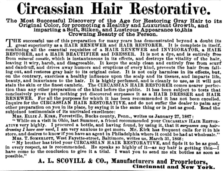 Rectangular, 7 1/4", Square Top, front & side panels, BIM, amber, side: "CIRCASSIAN" front: "HAIR - RESTORATIVE" side: "CINCINNATI" |
