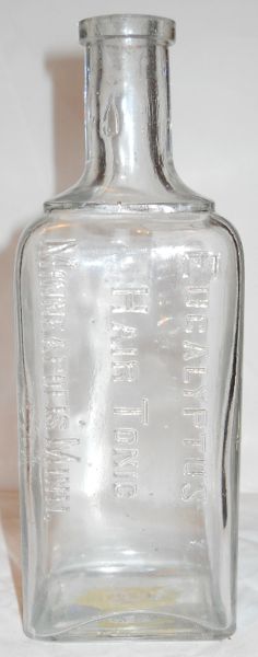 Rectangular, 6 7/8", square top, no panels, BIM, clear, front: "EUCALYPTUS - HAIR TONIC - MINNEAPOLIS MINN." |