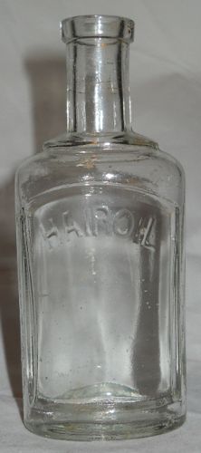 Oval, 4 3/8", Square Top, front and rear panels, BIM, clear, embossed on front: "HAIR OIL"